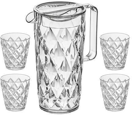 Elegáns és praktikus dekanter és pohár készlet Koziol CrystalA Koziol Crystal dekanter és 4 pohár készlet elegáns, csiszolt dizájnnal rendelkezik, és rendkívül tartós, törésálló SAN anyagból készült, amely megvédi az edényeket a hőmérséklet-változásoktól és a sérülésektől. A poharakat úgy tervezték, hogy könnyen egymásra helyezhetőek legyenek, így helyet takarítanak meg. Az egész készlet praktikus és könnyen karbantartható, mivel mosogatógépben mosható.