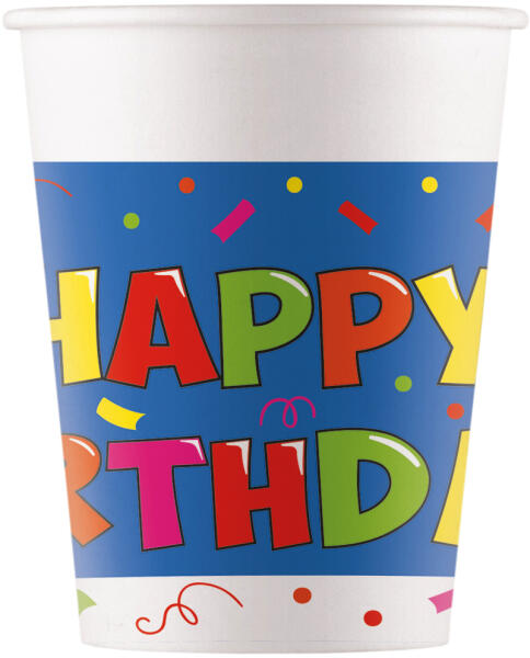 Procos Kékfehér alapú szülinapi "Happy Birthday" feliratú papírpohár 8db-os szett 200ml (93513)