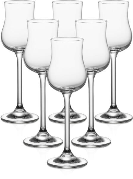 A CHARLIE 110 ml grappa/rum pohár egy luxus kristálypohár, amely különleges alakjának köszönhetően kiemeli kedvenc italai, például az olasz grappa, rum vagy más prémium szeszes italok egyedi aromáját és ízét. Ideális kiegészítő ínyencek és ínyencek számára, akik értékelik a funkcionalitást és az esztétikát egyaránt. A poharak 6 darabos szettben kaphatók . Ez a darab első osztályú kristályüvegből készült , amely kiváló tartósságával és ragyogó fényével tűnik ki. A termék cseh mesterséges üvegkészítők műhelyéből származik , akik nagy hangsúlyt fektetnek a minőségre és a tökéletes kivitelezésre. A pohár könnyen tisztítható, mosogatógépben mosható, hároméves garanciája pedig hosszú élettartamát és kiváló minőségét bizonyítja . A CHARLIE termékcsalád többféle pohárralkínál tökéletes étkezési élményt és kedvenc italok élvezetét, például martini, konyak vagy gin&tonic . Klasszikus, elegáns formájúak és kiváló minőségű kristályüvegből készülnek. A termékcsalád otthoni és professzionális használatra egyaránt alkalmas. A termék fő előnyei: