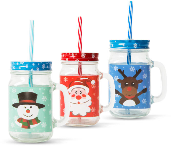 Üveg korsók, vidám karácsonyi mintákkal: Mikulás, hóember, rénszarvas, különböző színekben, fém zárókupakkal.